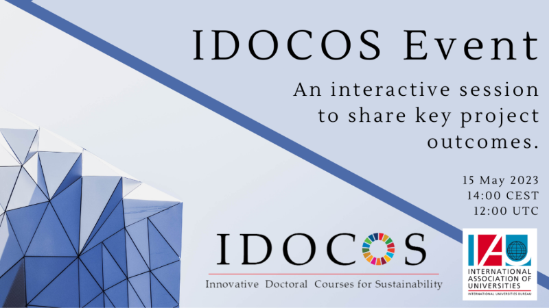 Innovative Doctoral Courses for Sustainability (IDOCOS) aims to enhance the quality of and increase access to doctoral courses through international co-creation and sharing. To support this objective, the main focus of the project has been to develop a methodology for international collaboration building on co-creation and sharing of doctoral courses. Join us online on 15 May at 14:00 CEST to hear the key project outcomes and participate in an interactive session where the audience can engage, ask questions and share their experience in terms of collaboration around doctoral courses.For more information, contact Trine Jensen, IAU HE & Digital Transformation Manager.
